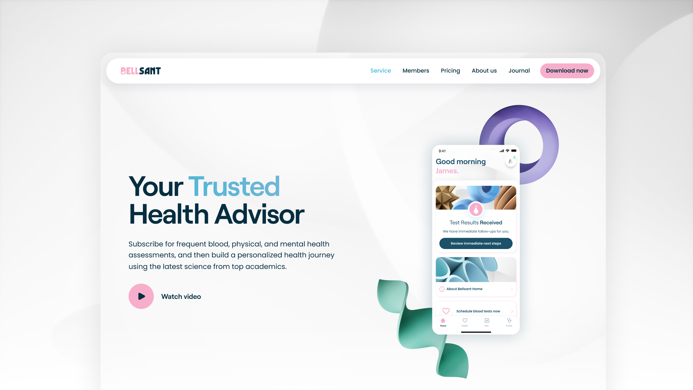 We developed a new logo and brand identity for Bellsant based on flowing natural shapes symbolising health, prosperity and support. We used a leaf icon in the word mark to bring this to life and also created a set of natural flowing 3D background elements for the wider brand. We utilised a colour palette that felt scientific and clean, but added flourishes of vibrant colours to punctuate the light backgrounds. Alongside these key elements, we crafted a series of bespoke animated 3D icons to represent each of the services monitored health systems. Each icon was based on an abstract scientific concept connected to the health system.