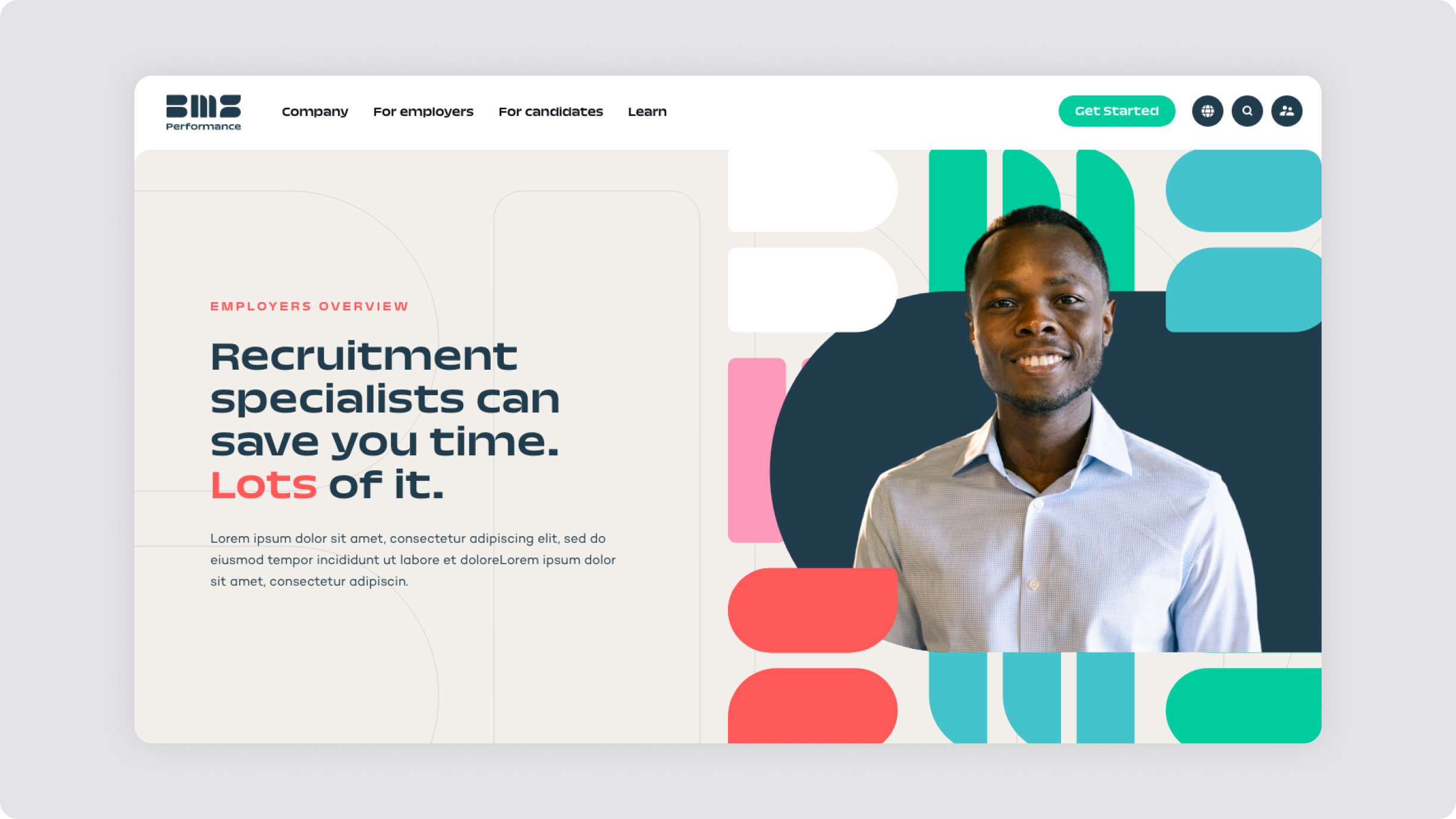 We created a bespoke block letter icon signifying the building blocks of a career. Alongside the block forms, we utilised colour-coded elements to signpost jobs and sections both across the website and in presentations, so every department at BMS felt like they owned a bit of the new brand.