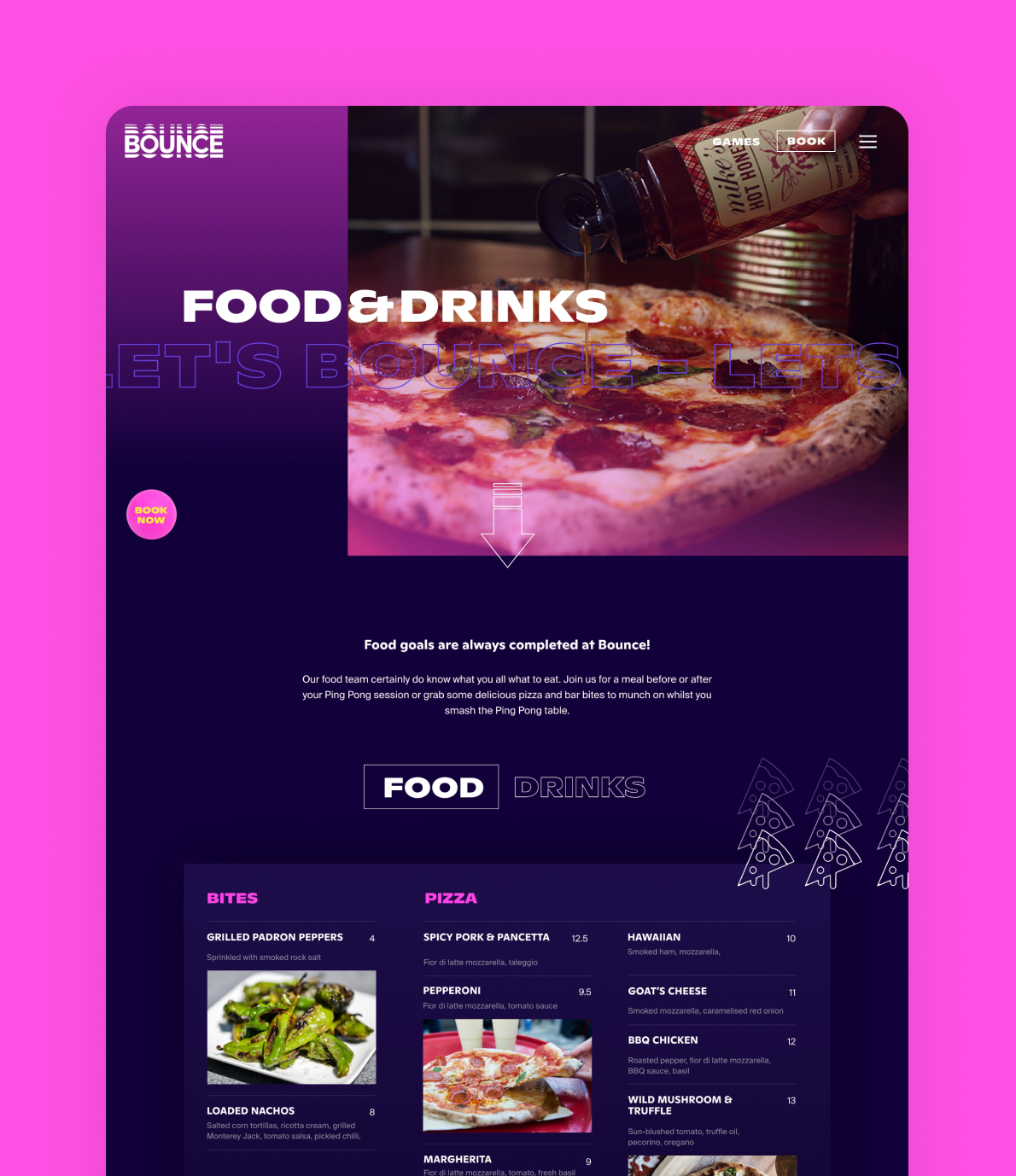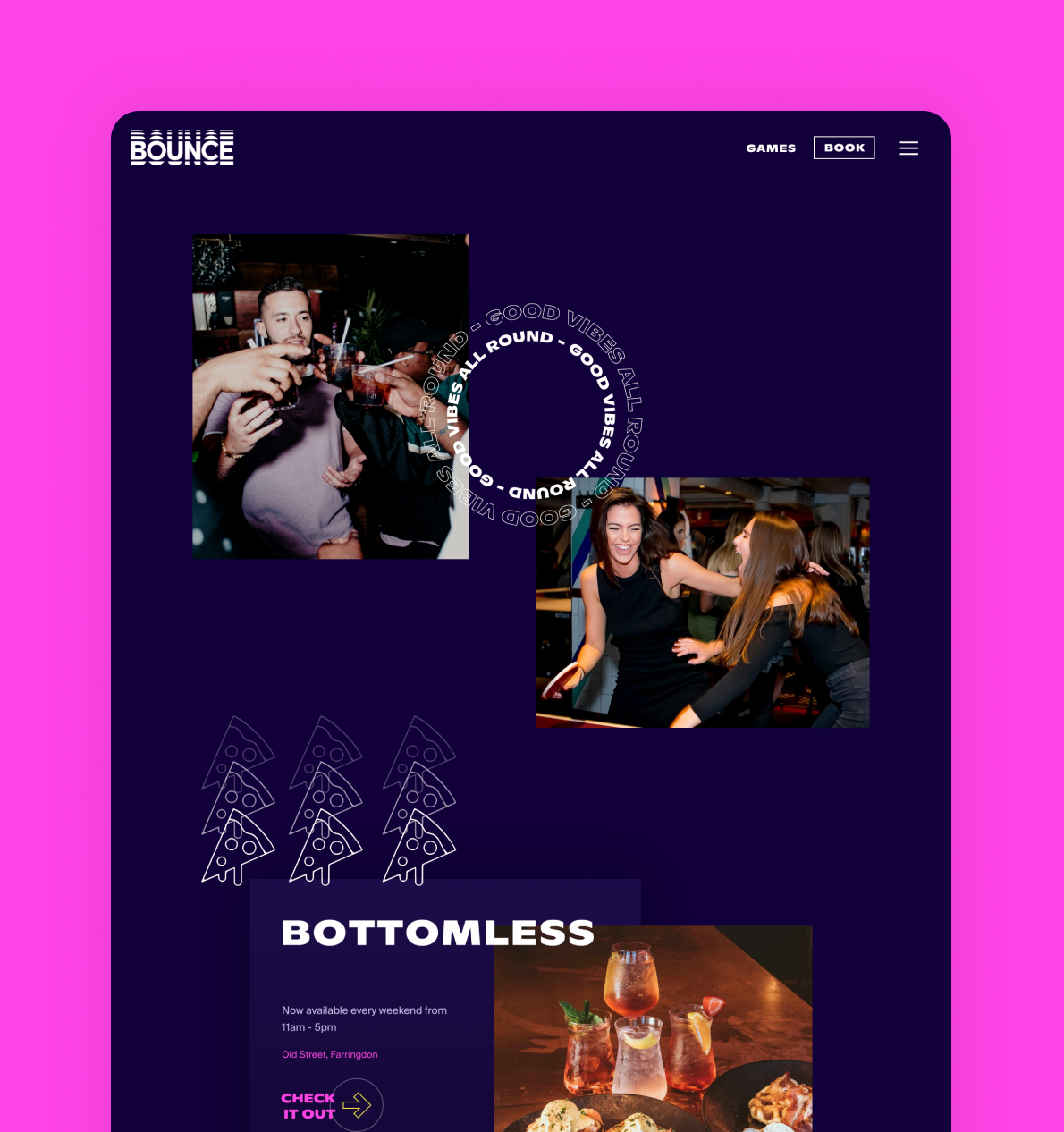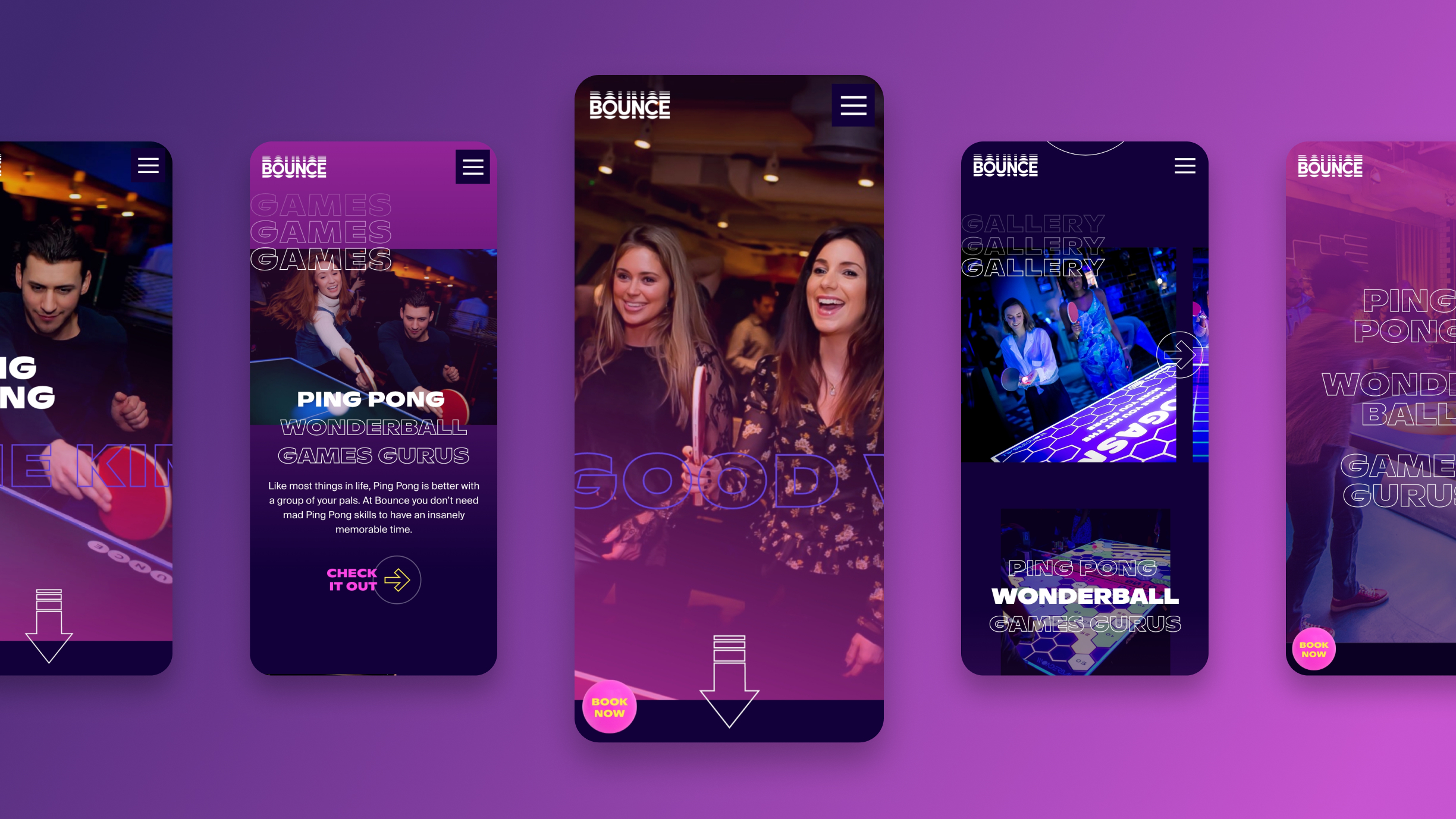 Bounce approached our team to design and build a website which would translate the in-venue experience into a playful, yet easy to navigate digital experience. Not only did the website need to reflect the energetic personality of Bounce but it also had to feel inclusive to all audiences and explain their offering seamlessly through visuals and messaging.