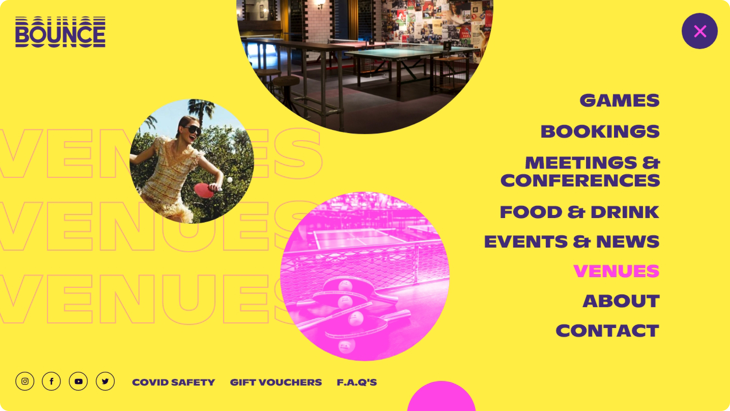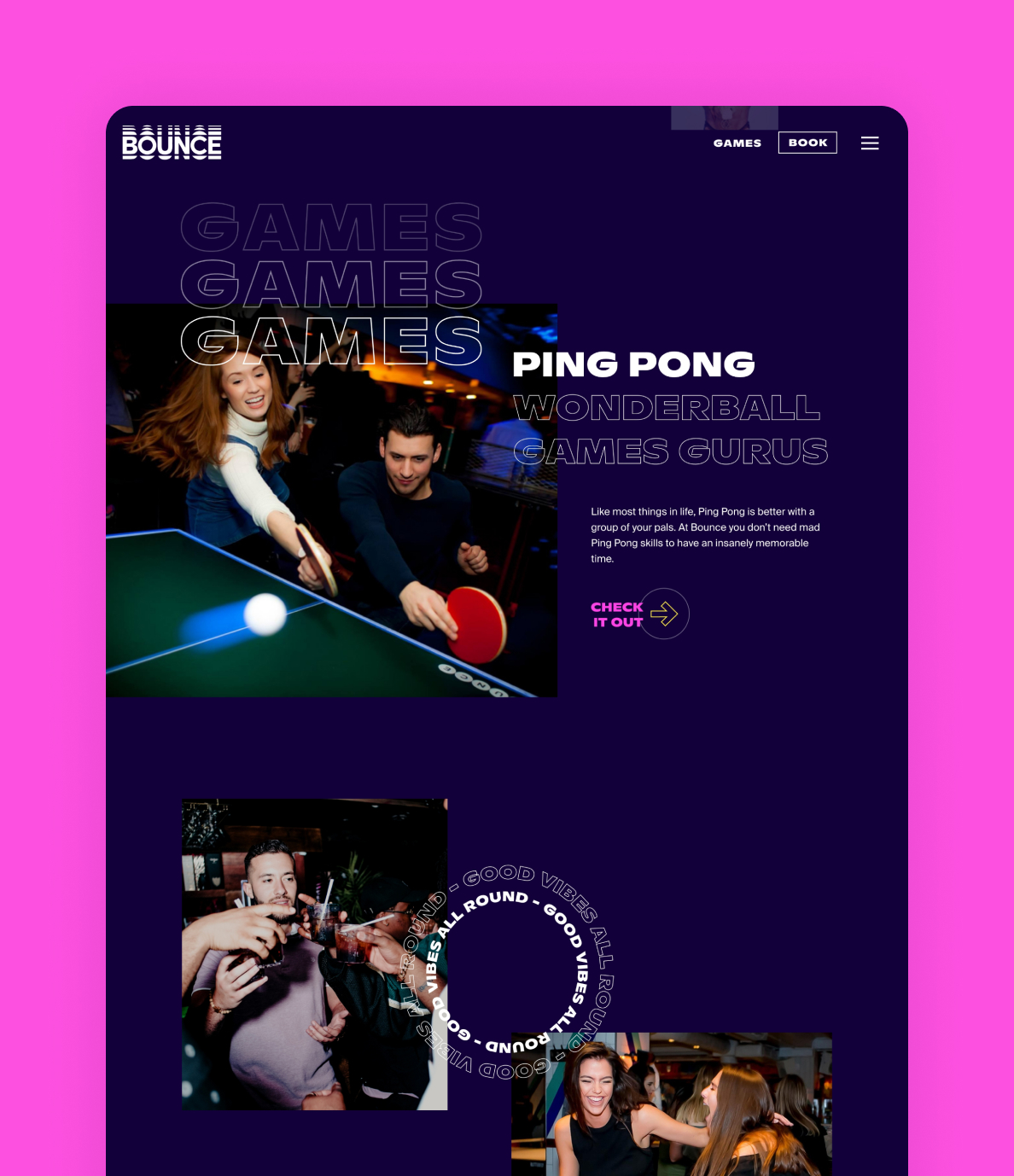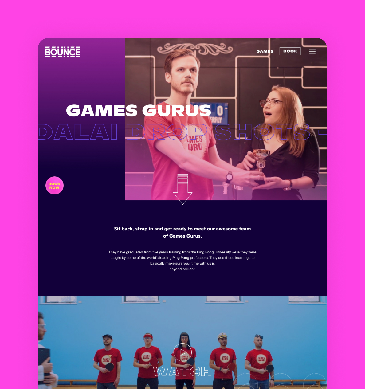 Bounce approached our team to design and build a website which would translate the in-venue experience into a playful, yet easy to navigate digital experience. Not only did the website need to reflect the energetic personality of Bounce but it also had to feel inclusive to all audiences and explain their offering seamlessly through visuals and messaging.
