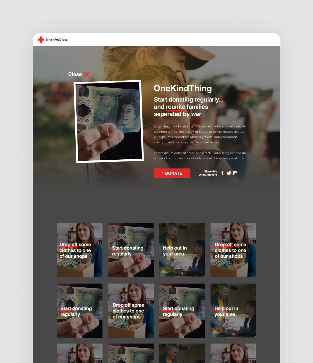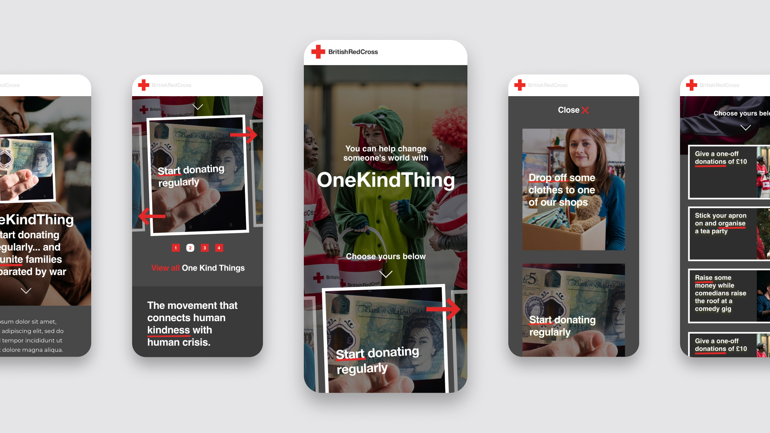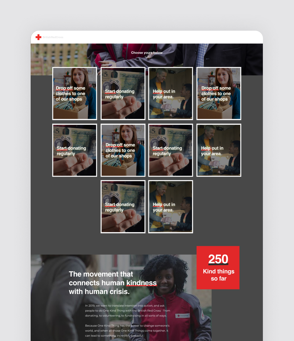 In spring 2019, we partnered with the British Red Cross on their latest campaign – OneKindThing. We were tasked with creating the digital platform which was part of a nationwide campaign, showing people that even the simplest things can change the life of someone in crisis. The site had to engage and encourage users, with clear call to actions and simple user journeys, for them to take the next step in offering their help for others.