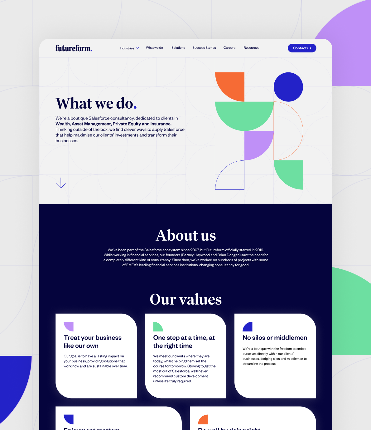 The new Futureform website is a bold, striking transformation that captures the essence of their brand while pushing it into the future. It’s the perfect example of a services-based business breaking free from the traditional mould of their peers, positioning Futureform as a frontrunner in the Salesforce consulting space, with a sophisticated yet approachable aesthetic that reflects their expertise and ambition.