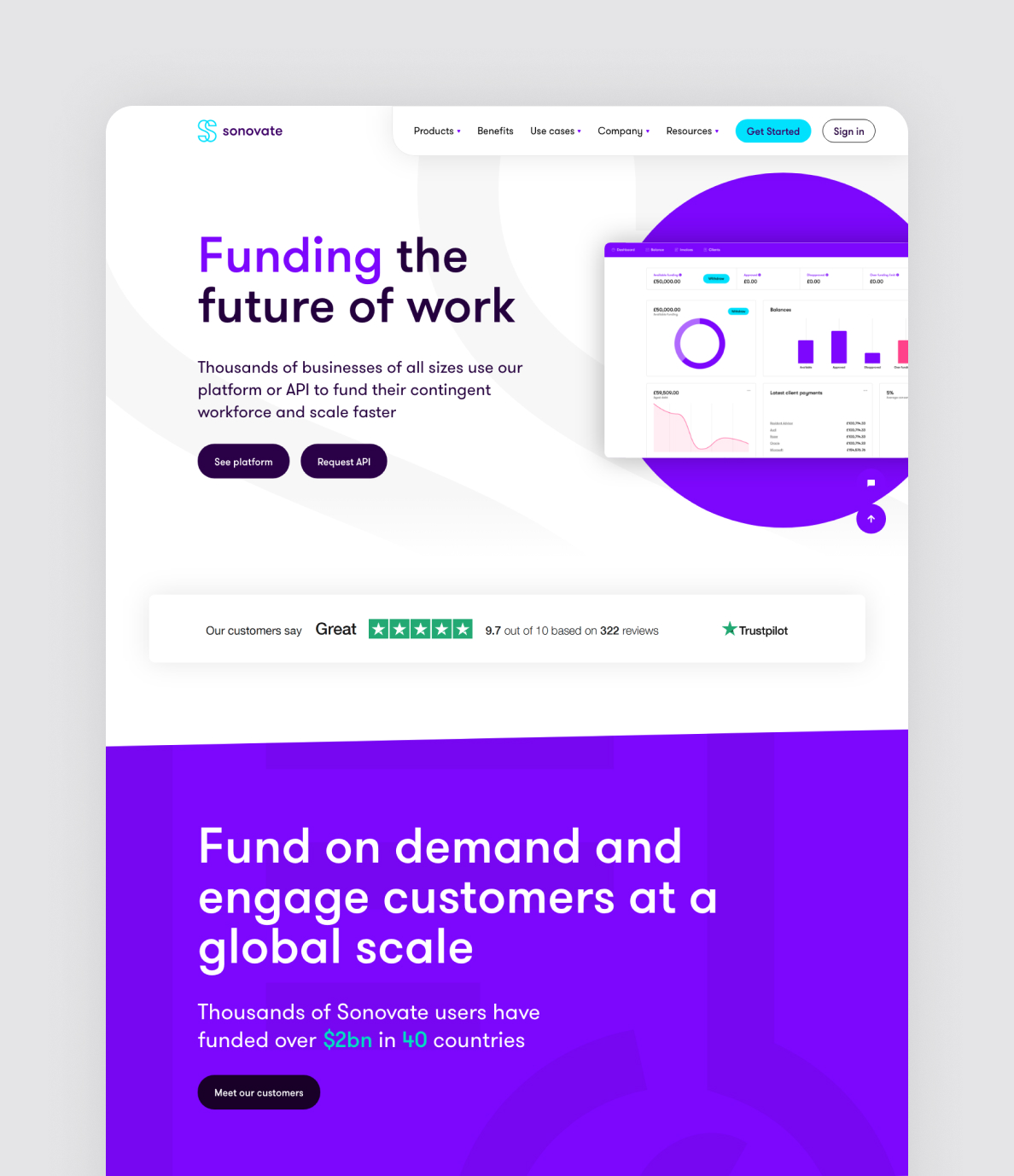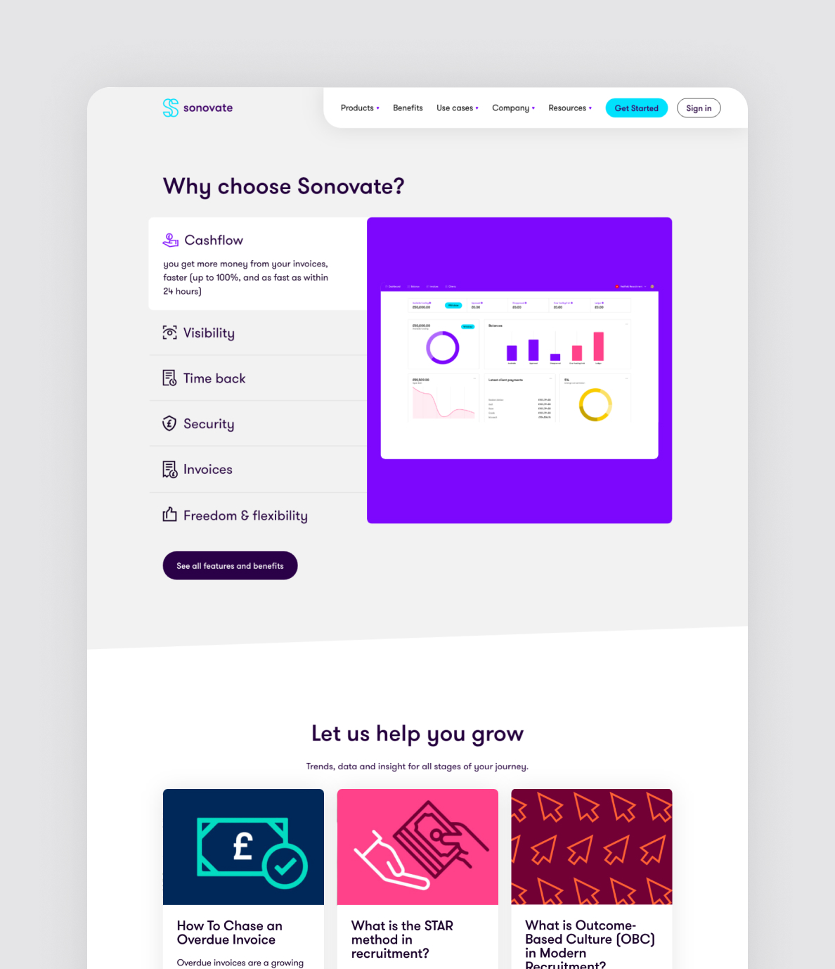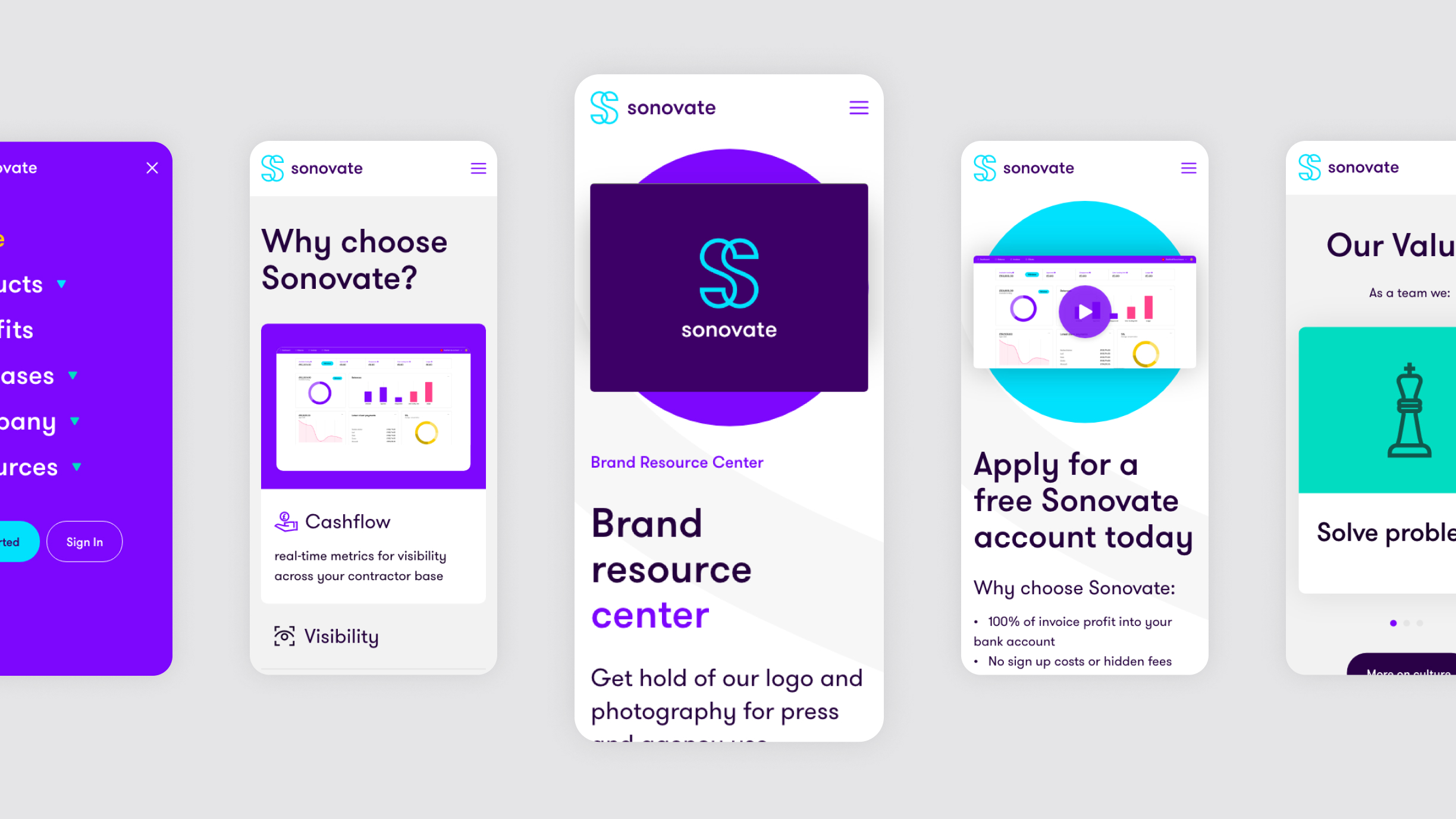 Sonovate approached us to create a new responsive website that would give them complete creative control over updating their website due to their constantly evolving needs. Spinning up new pages with complete flexibility was essential. The site also needed to handle showcases of complex product functionality, light marketing messaging and everything in between.