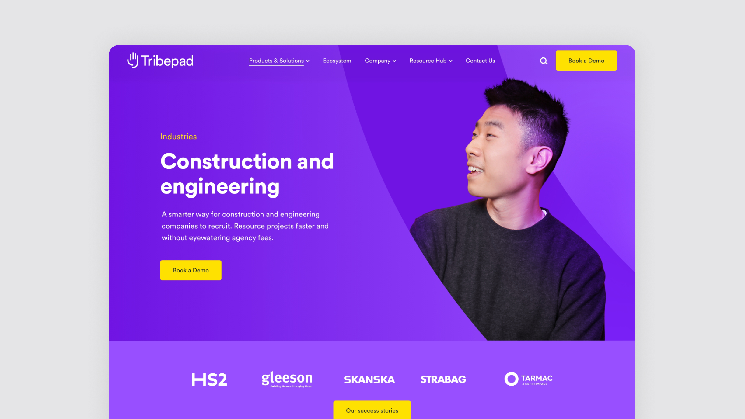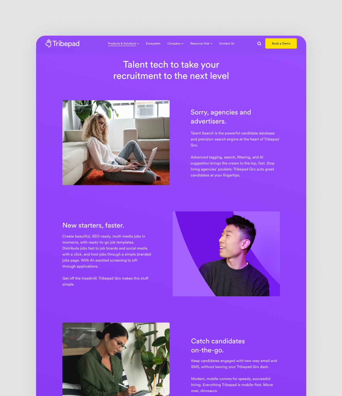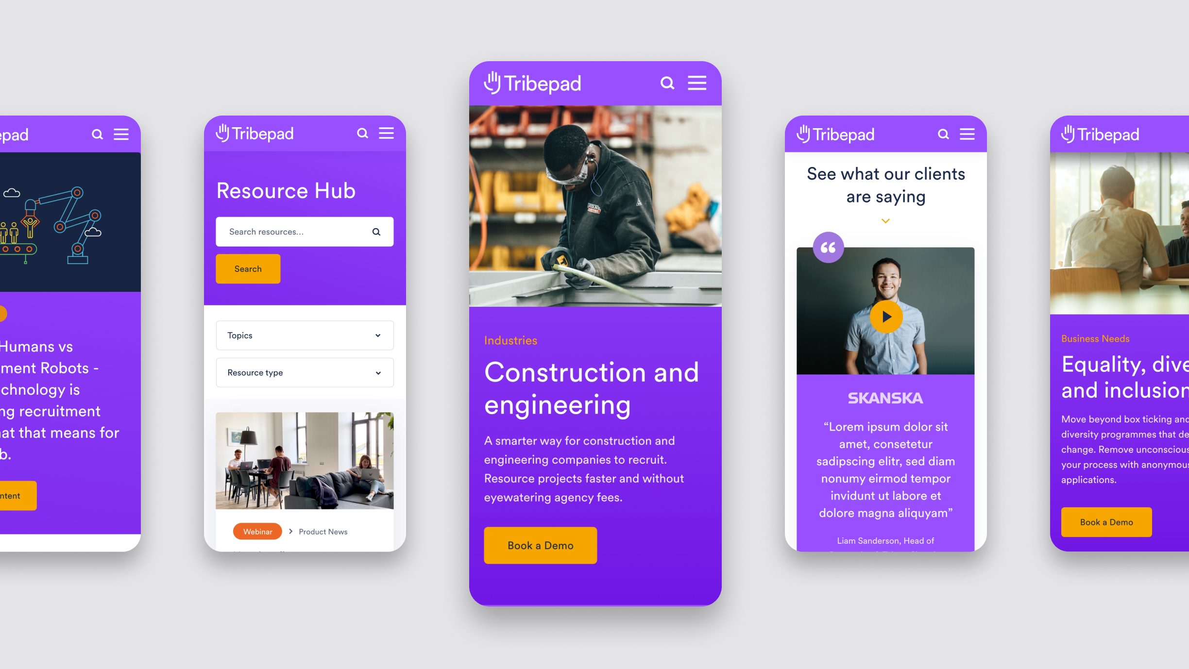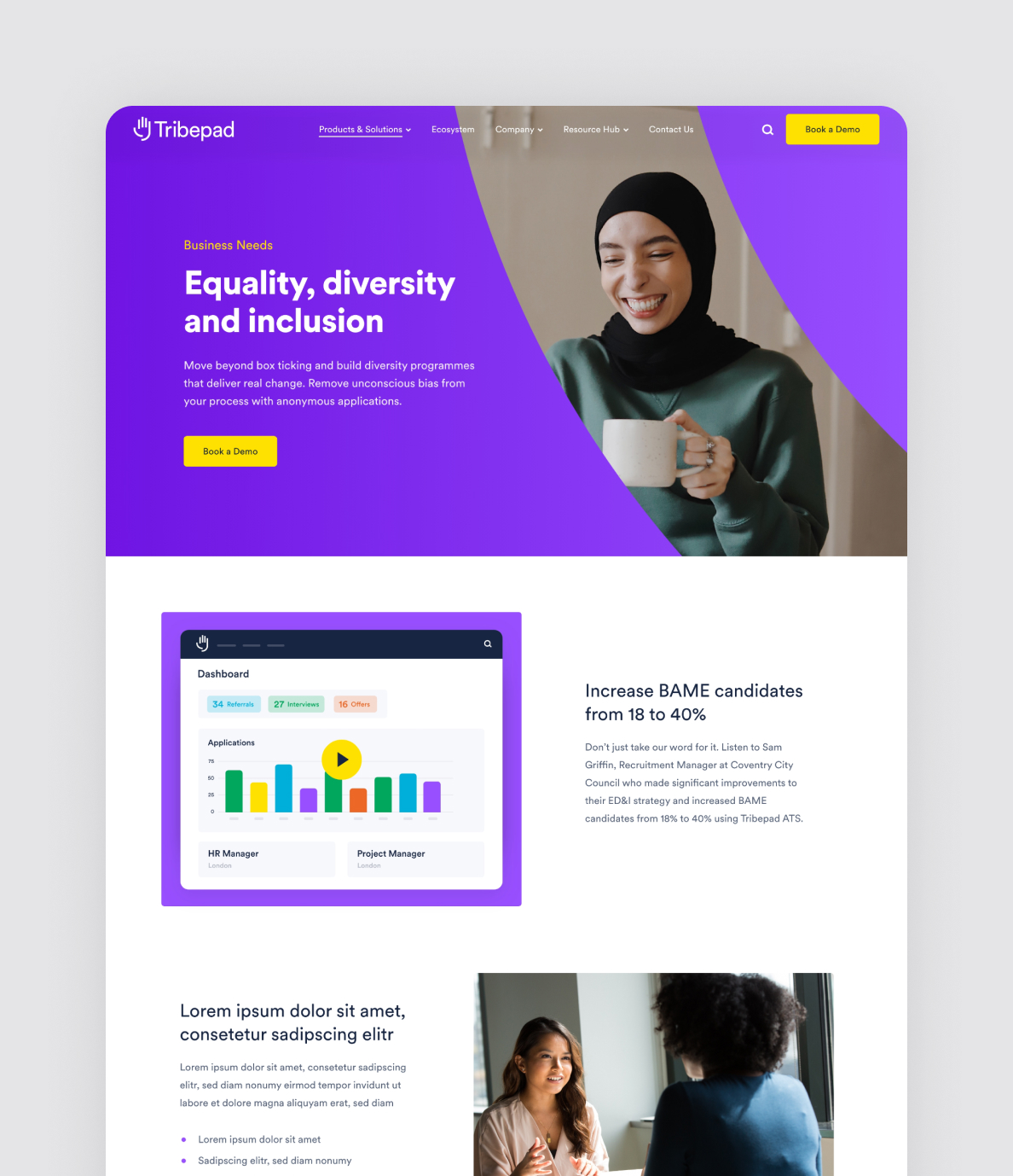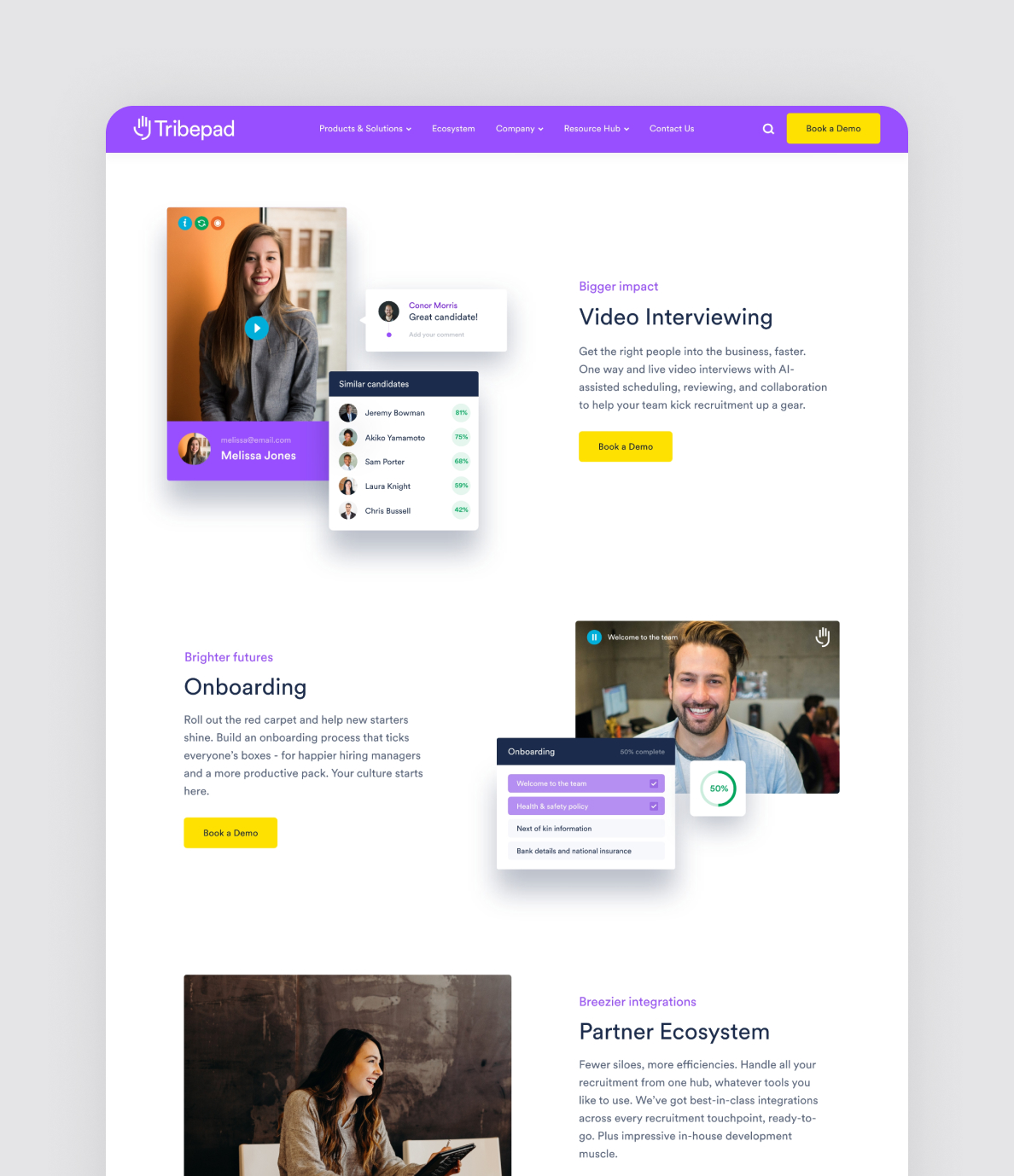 We took the decision to use a fully functional page builder approach that would give Tribepad the flexibility to build their own pages. To do so we needed to create a pool of components, each with the flexibility to work everywhere on the site. We came up with a streamlined user experience that communicated product features and benefits in an engaging way, educating the different types of visitors through informative content and software illustrations. We also wanted to increase brand awareness and create a point of difference within the industry, whilst telling Tribepad’s story and proposition. What makes Tribepad different to other recruitment companies is their people first approach, “People first, product second, profits third”. The idea of offering a personal service needed to be reflected on their website, to do so we used people imagery and cut out photography humanising the website.
