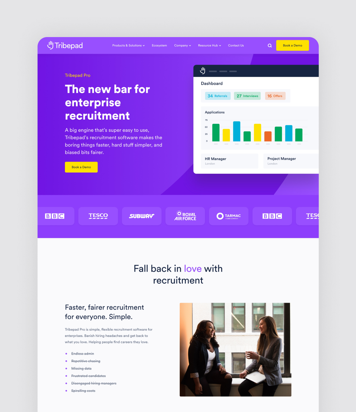 Tribepad are a B2B, Saas recruitment software provider based in Sheffield, who have been growing steadily for the last few years. They provide talent acquisition software to some of the best-known companies such as Tesco, BBC and Pizza Hut. They do so by using all the latest tech including video and AI to deliver an amazing experience to candidates, hiring managers and recruiters.